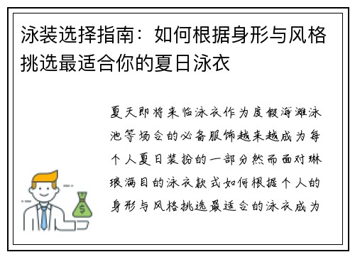 本文以《激情碰撞水中巅峰赛事 游泳争霸赛点燃速度与激情》为主题,通过详细分析游泳赛事的魅力和意义,揭示了这项水上运动如何成为全球最具挑战性与吸引力的赛事之一。文章从赛事的历史背景、竞技精神的传承、技术与训练的革新以及体育文化的影响等四个方面进行深入阐述。每一部分都紧密围绕着游泳赛事的激烈与精彩,展示了它在世界体育赛事中的独特地位与魅力。无论是运动员的超凡表现,还是观众的热情支持,游泳赛事无疑点燃了...