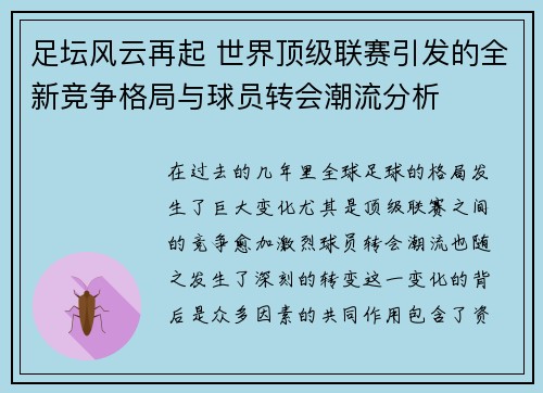 全球足球盛宴,不仅仅是比赛,更是人类文化与情感的缩影。从每四年一届的世界杯到年度精彩的欧洲冠军联赛,两项赛事堪称世界足坛的顶级盛事。它们不仅展示了全球最强的足球技术和战术,还承载了无数球迷的热情与梦想。世界杯自1930年诞生以来,已经成为全球最具影响力的体育赛事之一,欧洲冠军联赛作为俱乐部间最具竞技性的赛事,也成为了欧洲及全球顶级足球俱乐部展示实力的舞台。本文将从四个方面详细探讨全球足球盛宴的风云...