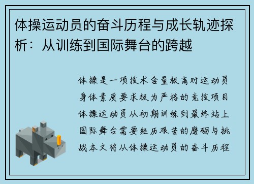 竞技体操评分体系是评定运动员表现、技巧与艺术性的重要标准。随着竞技体操项目的不断发展,评分体系也经历了多次变革。本文将对竞技体操评分体系进行深入分析,从评分体系的构建、评分标准对运动员的影响、评分对比赛策略的作用、以及未来发展趋势四个方面进行详细剖析。通过这些讨论,本文不仅揭示了现行评分体系的优势与不足,也展望了未来可能的改革方向。通过分析评分体系如何影响运动员表现,进一步探讨体操项目如何更好地发...