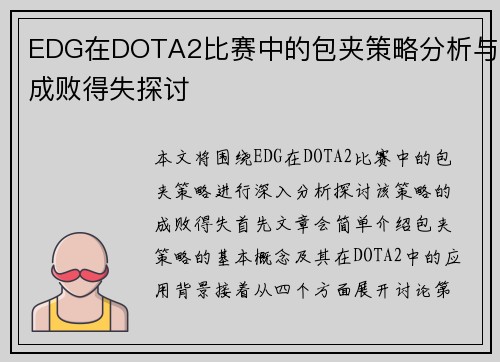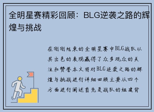 在CS:GO比赛中,团队策略的制定和执行对胜负起着至关重要的作用。BLG作为一支积极参与职业赛事的战队,其边路渗透策略在比赛中展现出了独特的成功与不足之处。本文将从四个方面详细分析BLG在CS:GO比赛中的边路渗透策略,包括其战术设计、选手配合、应对敌方反击能力以及战术调整能力。通过深入探讨这些方面,可以更好地理解BLG在比赛过程中所取得的成就及面临的挑战,为未来的发展提供有益的参考。 1、战术...